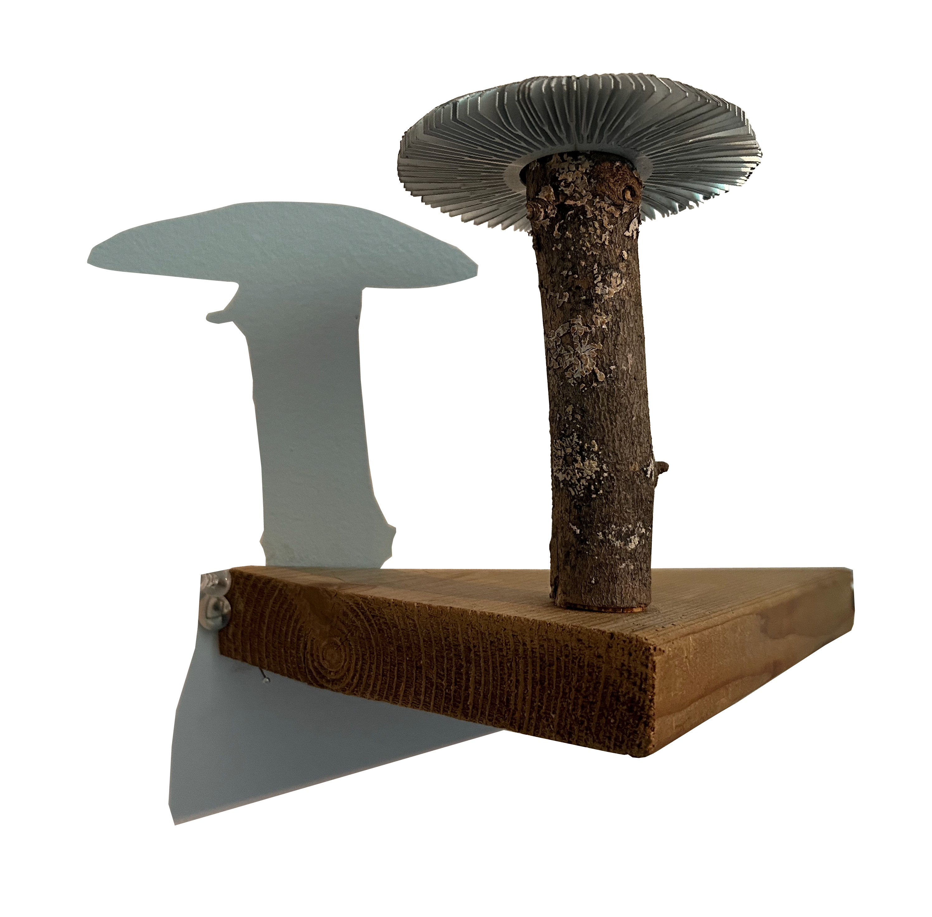 Mushroom sculpture made out of a piece of a desktop computer fan, and a stick.