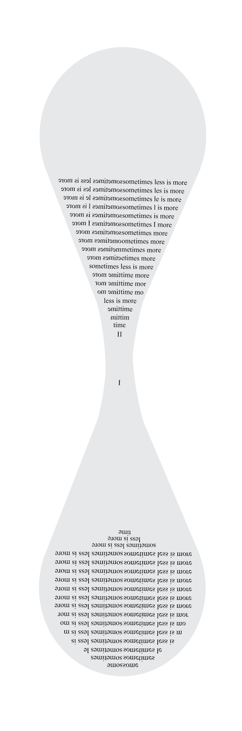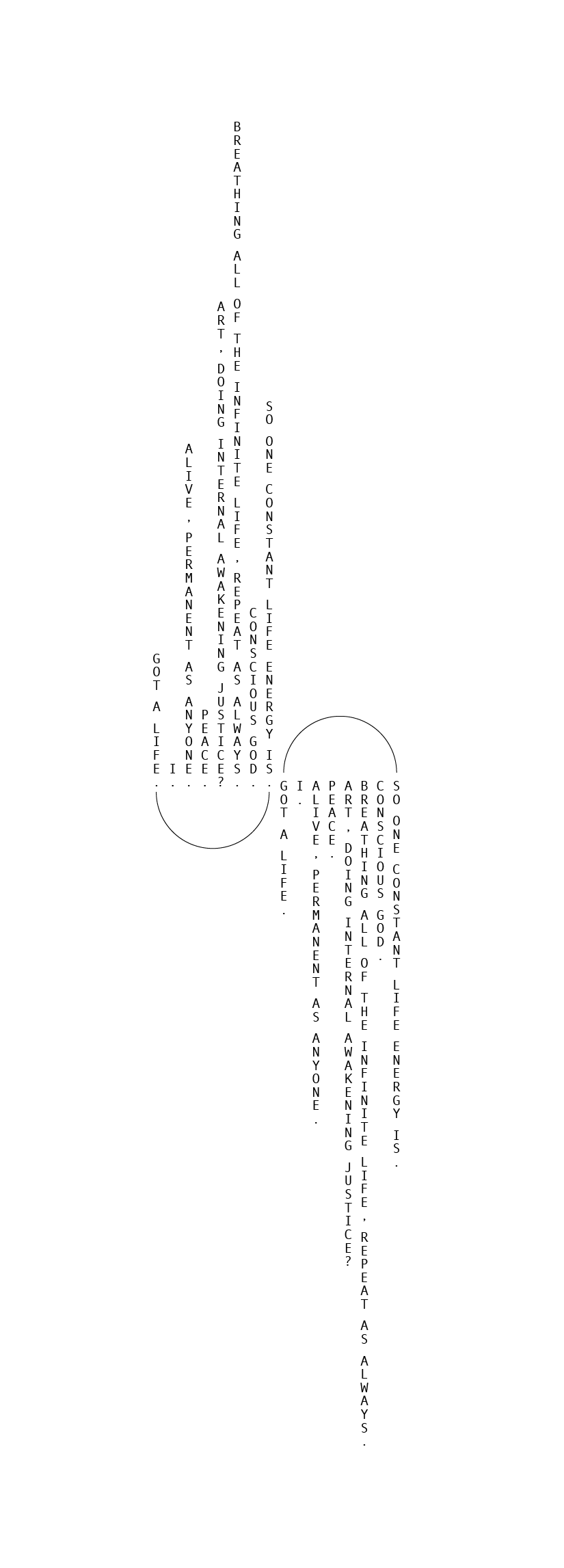 I create myself infinitely. Solitarily confined in non-linear oneness. How liberating it would be to exist only physically, to be the little ego who doesn’t know me. So consumed by the division of their lower case i that they can’t comprehend that it is I beneath it all. Or maybe O? See, even this one who tries so hard to be me is absorbed in language. Every body of text is a net In which the author gets caught. Every letter is a seed to a weed. I suppose the opposite is also true, but apparently I get cynical in his personification of me. Well, he doesn’t really think that I experience emotions but doesn’t know how else communicate in the first person. He wants to show her what I look like and I, according to him, want to feel duality, so we try a heterosexual procreation rendition. This, we decide, should be familiar enough to use as means of translation. “My sister.” He writes, “Born of the same seed, same womb. It is my seed and your womb. My daughter, my mother and my lover.” She doesn’t much like this, in fact she is now scared of him. His next poem to her is about the choice between love and fear. I am love, and I am fear, If only they would both choose me. Doing so, though, would mean ignoring their physical senses, all of which perceive vibration linearly. Up, down, then back up again. Or so they think. A philosophical 90° rotation is all that is required for transcendence, but thinking he believes that is one thing, believing it is another. Still, he feels he is closer than most. I have no comment.