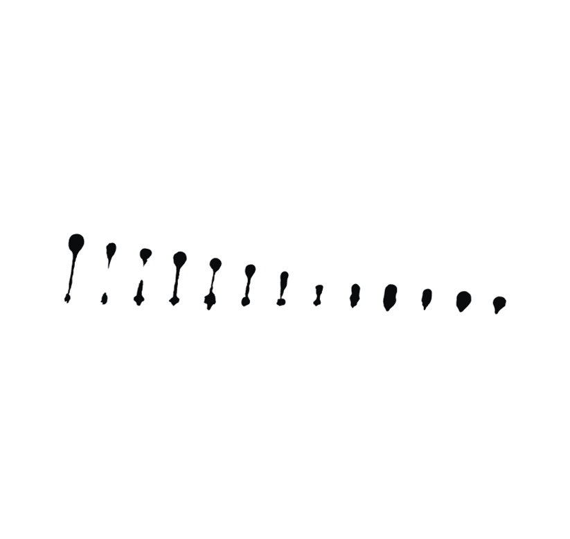 Years ago, your parents painted the walls and window frame of your childhood room. Some dark blue paint got on the curtain’s bead chain, which then must have touched the light blue window frame, leaving a mark. One day you glimpse your reflection in it. A poem. You rotate and read it. The only characters you identify come from the English alphabet. Despite this, you are inclined to read the poem from the right to the left, as it is in this direction that a linear representation of growth and transformation reveals itself. You can now separate the piece into two parts, of seven stages each. This Evoke genesis. A story written in Biblical Hebrew, a language written from right to left. The first part is about a period which becomes an exclamation mark. The second part is about the exclamation mark, which becomes something greater. During the process of this second transformation, the character overextends until mitosis occurs. Duality. The beauty of balance, or perhaps the intrinsic dissonance of division. The poem, which had previously been limited to one line, is now on two. Finally, reconnecting on the seventh stage of its second incarnation, the character is one again. Head in the clouds and feet on the ground. It has transcended the dimension of language, where characters are limited by height, and restricted to one line. It, now, reads like a musical note on a scale.